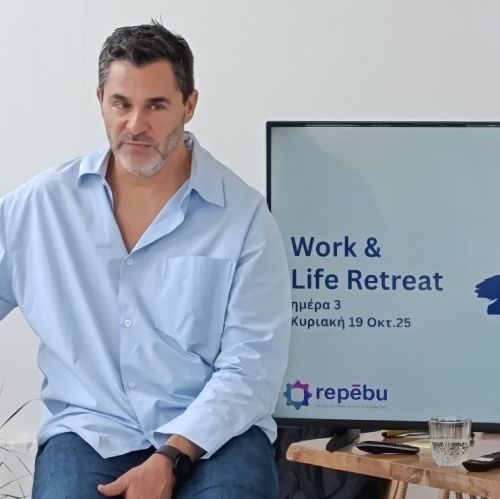 Κάθομαι δίπλα σου, σε βλέπω, σου κάνω ερωτήσεις που ίσως έχεις καιρό να κάνεις στον εαυτό σου. Σου δίνω εργαλεία που δουλεύουν. Ό,τι λέμε το έχω δοκιμάσει: σε αίθουσες, εργοστάσια, meeting rooms. Είναι ένα βιωματικό και πρακτικό retreat.