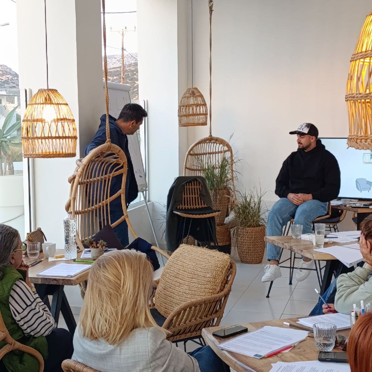 Κάθομαι δίπλα σου, σε βλέπω, σου κάνω ερωτήσεις που ίσως έχεις καιρό να κάνεις στον εαυτό σου. Σου δίνω εργαλεία που δουλεύουν. Ό,τι λέμε το έχω δοκιμάσει: σε αίθουσες, εργοστάσια, meeting rooms. Είναι ένα βιωματικό και πρακτικό retreat.